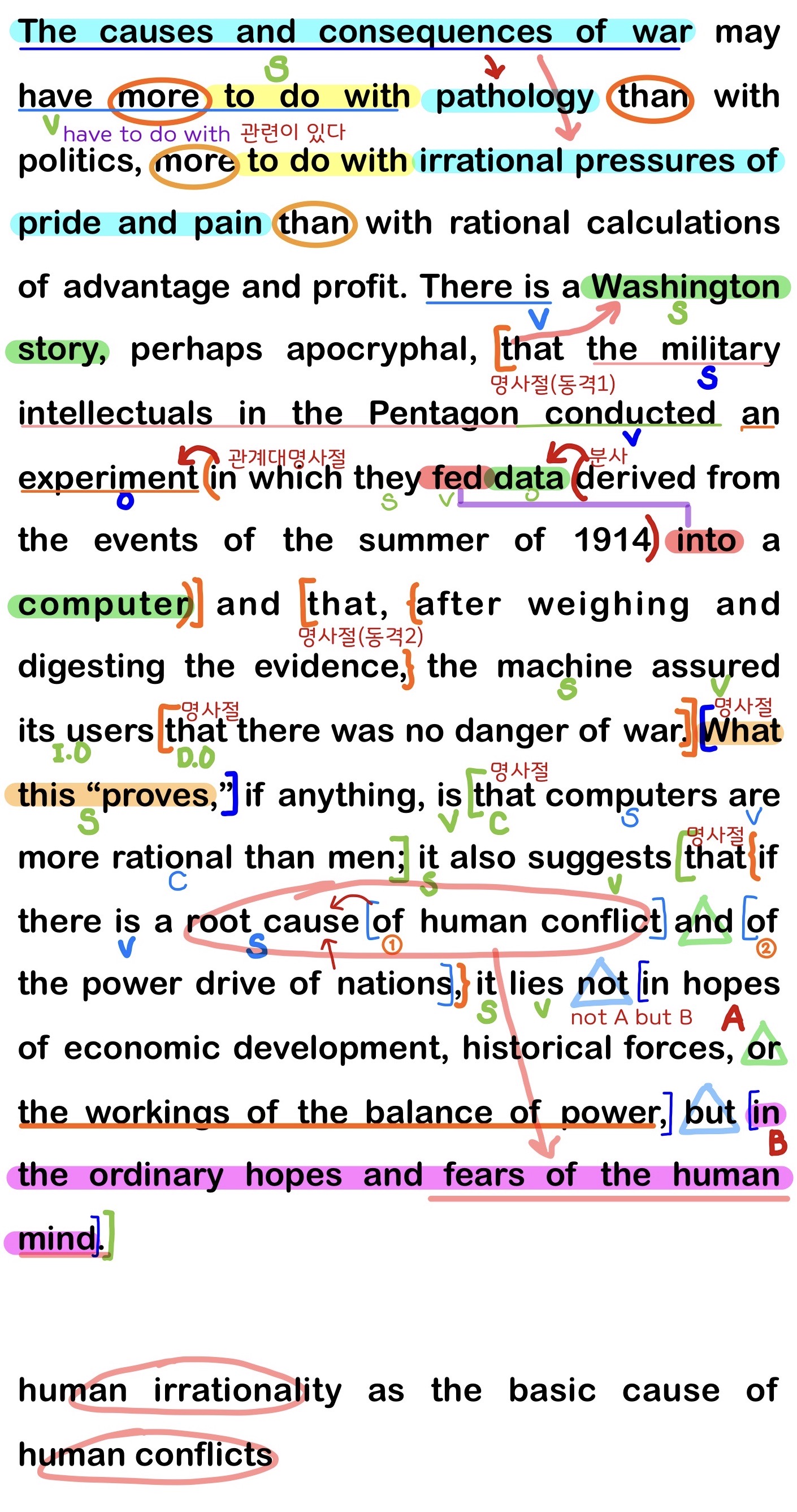 The causes and consequences of war 전쟁의 원인과 결과는 may have more to do with pathology 아마도 병적인 측면과 더 관련이 있는 것 같다. than with politics, 정치보다는 more to do with irrational pressures of pride and pain 자존심과 고통이 주는 비이성적인 압박과 더 관련이 있을 수 있다. than with rational calculations of advantage and profit. 이점과 이익에 대한 이성적인 계산 보다는