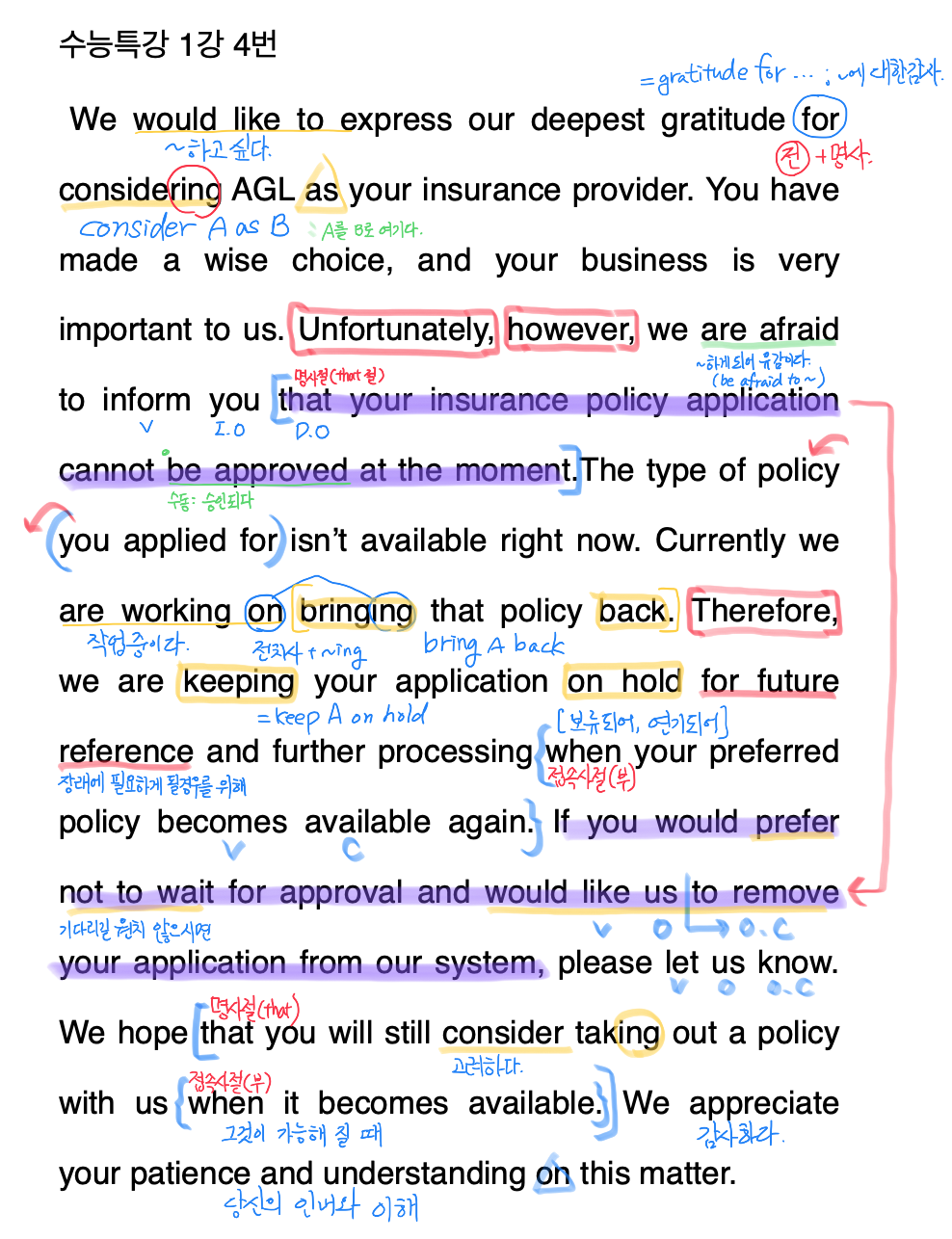 Therefore, 그러므로 we are keeping your application on hold 우리는 당신의 신청을 보류하고 있다 for future reference and further processing 이후에 참고도 하고 차후 처리를 위해서 when your preferred policy becomes available again. 당신이 원하시는 정책이 다시금 이용 가능해지면