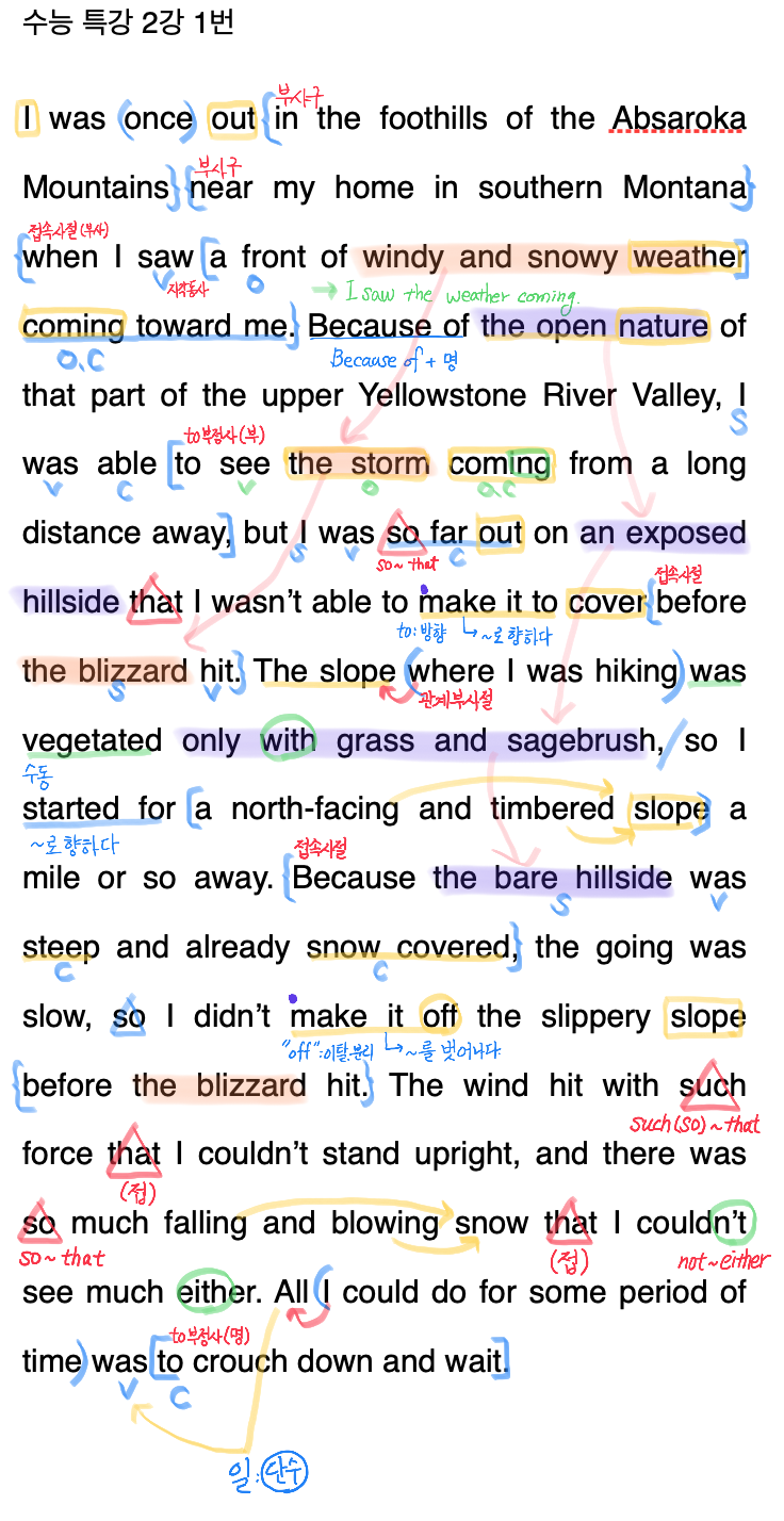 The wind hit with such force 바람이 무척 강한 힘으로 불어 닥쳤다 that I couldn’t stand upright,내가 똑바로 서 있을 수 없을 정도로 and there was so much falling and blowing snow 그리고 무척 많은 눈이 내리면서 강하게 불어 닥치고 있었다 that I couldn’t see much either. 내가 거의 앞을 볼수 없을 정도로
