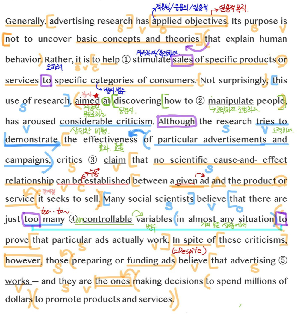 Generally, advertising research has applied objectives. Its purpose is not to uncover basic concepts and theories that explain human behavior. Rather, it is to help ① stimulate sales of specific products or services to specific categories of consumers. Not surprisingly, this use of research, aimed at discovering how to ② manipulate people, has aroused considerable criticism. Although the research tries to demonstrate the effectiveness of particular advertisements and campaigns, critics ③ claim that no scientific cause-and-effect relationship can be established between a given ad and the product or service it seeks to sell. Many social scientists believe that there are just too many ④ controllable variables in almost any situation to prove that particular ads actually work. In spite of these criticisms, however, those preparing or funding ads believe that advertising ⑤ works and they are the ones making decisions to spend millions of dollars to promote products and services.