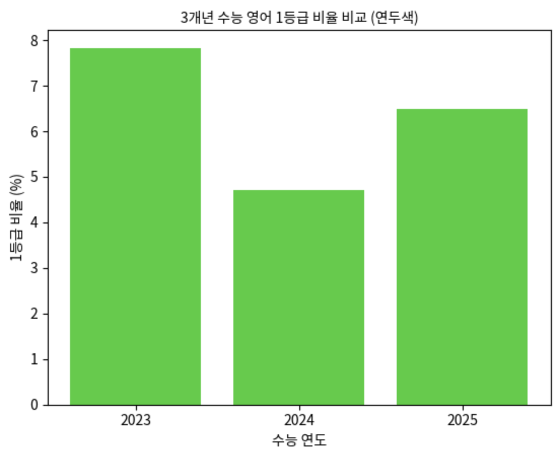 2023~2025학년도 수능 영어를 비교하면, 2024학년도에 난이도와 변별력이 가장 강했고 1등급 비율이 크게 낮아졌습니다.